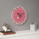 Shabby Tea Cups Wall Clock - é um design de arte gráfica. O fundo do relógio é uma placa cor-de-rosa/mauve, com cor-de-rosa sólida no centro e rosas shabby ao redor da borda. O centro do relógio é um pote de café/chá com uma xícara de solteiro e um disco. Os números neste relógio são marrom-escuro e descansam em equipes individuais de shabby. Sinta-se livre para personalizar o relógio com o nome de uma pessoa, se quiser. Este mesmo relógio está disponível com um ursinho de pelúcia e um carrinho de chá também no centro.