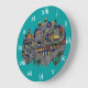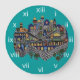 Eu tirei esta foto de um prato cerâmico armênio pintado manualmente e feito à mão com uma imagem colorida da Cidade Velha de Jerusalém. Há um fundo teal e os Numerais Romanos são brancos.