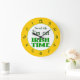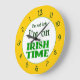 Este divertido relógio de parede diz que não estou atrasado, estou no horário irlandês, com letras de entrelaçamento celta em verde, números ao contrário em um fundo laranja.