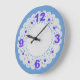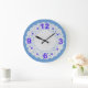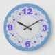 Uma linda toalhinha de papel de renda branca cria um mostrador de relógio alegre com fundo azul e pontos azuis para marcar as 12 posições dos números. Linda decoração para uma cozinha, cantinho do café da manhã ou restaurante.