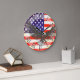Um relógio de bandeira único no estilo antigo da América em tons vermelhos, brancos e azuis com águia careca voando. Projetado usando a bandeira da América e adicionando um pouco de tratamento de safra. Desenho e design por Sarah Trett. Pareceria excelente num quarto patriótico, salão ou bar.