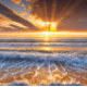 A luz do sol da manhã envia listras de ouro através das nuvens e saltando do surf em uma praia deserta.