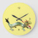 Dragão dourado em verdes e dourados, senta-se no fundo do relógio. Quatro algarismos (12, 3, 6 e 9) são pretos. Tudo colocado sobre fundo amarelo claro.
