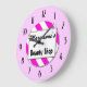 Um relógio de parede original lendo Compro Beauty em letras de bloco com espaço para o seu nome em um script retrô em um fundo listrado rosa e branco cercado por números pretos em rosa.