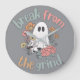 Um relógio com a frase "Quebre a Rotina" em letras garrafais, acompanhado por um gráfico de um fantasma fofo de Halloween adornado com flores coloridas, criando um design festivo e caprichoso.