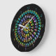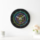 Um relógio acrílico plano decorado com uma mandala colorida feita de Mini Bean Poads™. Esta é uma foto de um lote de esculturas Poad™ de edição limitada pintadas individualmente por Melody Pena e produzidas por Windstone Editions.
