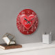 Um coração com asas e a palavra "amor" num fundo vermelho com espirais estilísticas