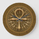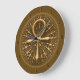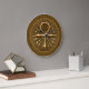 Em um fundo marrom, meio barulhento, este design de relógio mostra um ornamento antigo egípcio decorado com padrões circulares, um grande e um menor, de hastes de ouro, ligados um ao outro. Bem no meio do ornamento, o antigo símbolo egípcio da vida, conhecido como "ANKH". A borda tem um ouro brilhando ao seu redor, assim como os números das horas escuras.