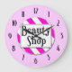 Um relógio de parede único lendo Compro Beauty em letras retrorreflectoras em um fundo listrado rosa e branco cercado por números pretos em rosa. Clique em Personalizar para alterar as cores de fundo e muito mais.