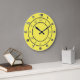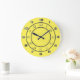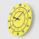 Números romanos e árabes mostrados em anéis externos. Marcas de hash em círculo interno. Numerais em cores prateadas metálicas, dividindo anéis em cinzas escuras, todos em um fundo amarelo alegre.