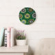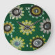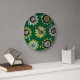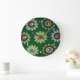 O padrão de margarida afghan. O fundo é verde com flores em amarelos, castanhos, bronzeados, cinzas e verdes. Numerais são brancos.
