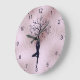 Um design de relógio lindo, moderno e espiritual apresentando em seu centro a silhueta preta de uma mulher em uma pose de yoga. Seus braços estão esticados sobre sua cabeça e se fundem com a silhueta de uma árvore pequena. O fundo está em tons de rosa claro pastel.
