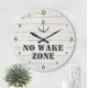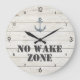 O relógio náutico "Zona sem Acordar" da Boutique Co. náutica apresenta um fundo de madeira rústico, âncora de aquarela, texto de tipografia náutica de stencil e números modernos de tipografia de blocos. O relógio perfeito para a sua casa de praia ou sala de estar costeira. #DIY #Costeira #Decor #Náutico #NoWakeZone