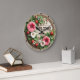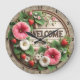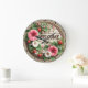 Bem-vindos convidados com o encanto do campo usando este encantador relógio de parede. Apresenta uma mensagem de "BEM-VINDO" rodeada por lindas glórias matinais rosa e branca, verde-luxuoso, morangos maduros, todos colocados contra um fundo ao estilo da rusticidade e borda da corda. Perfeito para cozinhas, entradas ou qualquer espaço que precise de um toque de apelação fresca de jardim.