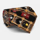 Este laço colorido caracteriza um teste padrão abstrato de repetição de uma garrafa vermelha e preta ereta do vinho de Borgonha ao lado de três mais garrafas em um marrom, em um ouro e em uma cremalheira de madeira amarela do vinho. Um fundo alaranjado rústico da parede de tijolo termina a composição.