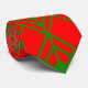 Esta gravata tem um design de arte de formas de diamante, e linhas em verde num campo de vermelho.