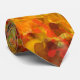This necktie features a digital collage made with many layers and textures in shades of yellow, orange, green, brown and red orange.