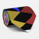 Esta gravata tem um design Bauhaus de formas aleatórias em azul, lacre, amarelo, vermelho e laranja.