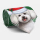 Uma adorável xadrez de férias verde com um adorável cão Bichon Frise vestindo um chapéu de Papai Noel festivo vermelho para as comemorações de feriado do amante do cachorro.