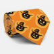 Gravata no pescoço, roupa de negócios e acessório casual de declaração de moda de roupa com bruxa brilhante no design de trabalho de arte de fundo laranja pelo TheFabricSeal no Zazzle com uma silhueta preta e escura de uma abóbora com aspecto brutal vestindo um chapéu de coroa cônica pontiagudo e uma alça de fivela com uma flamejante branca quente ouro laranja no fundo e através dos olhos de abóbora esculpidos, nariz e boca.