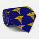Esta gravata azul é decorada com imagens múltiplas de um caducério dourado.