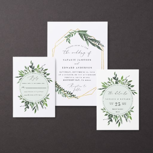 design ousado moderno com uma estrutura geométrica dourada com uma bela folhagem de folha de cor d'água. Esta elegante coleção rústica é uma adição de excelente a um casamento de outono ou primavera e apresenta todos os produtos necessários para o seu dia especial - guarde as datas, os convites, os planejadores de mesas e muito mais.