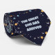 Celebrando um chá de fraldas, um pai veste uma gravata caprichosa adornada de estrelas e planetas, abraçando seu novo papel com alegria.