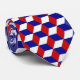 Blocos 3D em vermelho, branco e azul. Eles são empilhados de forma que, ao olhá-los, a ilusão óptica é que eles mudam de orientação. Mesma imagem na frente e no verso da gravata.