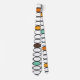 Esta gravata tem uma design de ovais retrô dos anos 70 em branco, marrom, azul e dois tons de laranja.