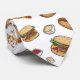 Uma gravata engraçada com um padrão de comida rápido com hambúrgueres, cachorros-quentes, pizza e molhos de mergulho.