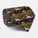 Um cão negro Labrador Retriever vestindo um Pai Natal que dorme pacificamente no chão com as luzes da árvore de Natal ao fundo