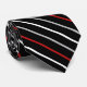 Essa gravata apresenta faixas finas em cinzas, vermelhas e brancas em fundo preto para um aspecto elegante e sofisticado.