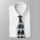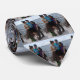 A gravata dos homens com colagem da foto nos azuis e nos cinzas.