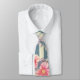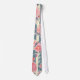 Uma gravata com um belo padrão, com flores bonito cor-de-rosa, coladas sobre um padrão listrado composto por listras azuis e cremosas.