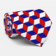 Blocos 3D em vermelho, branco e azul. Eles são empilhados de forma que à medida que você os olha, a ilusão óptica é que eles mudam de orientação. O fundo da gravata é vermelho sólido.