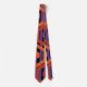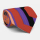 Essa gravata tem um design geométrico de hexágonos em quatro tons de laranja num campo de listras pretas e roxas.
