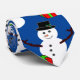Snowman sorridente, com braços estendidos, é apresentado com um presente de Natal num fundo azul