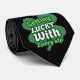 Adicione um toque de charme e humor à sua Rua. Esta gravata de na moda apresenta um vibrante trevo de quatro folhas com a frase lúdica *"Lucky With Any Sip"* fazer-o o acessório perfeito para festas, desfiles ou comemorações de escritório. Saia com um tom alegre e ousado para a sorte dos irlandeses, mantendo seu olhar afiado e espirituoso.
