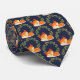 Gravata azul escura com um padrão composto por um desenho de desenho animado de uma raposa laranja fofa dormindo pacificamente. Uma coroa verde de folhas atrás.