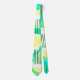 Esta gravata tem uma design moderna do século médio que se parece com uma tecelagem com linhas amarelas e verdes num campo de azul claro com nuvens.