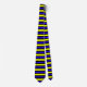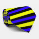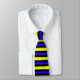 Esta gravata tem um legal design listrado azul e amarelo nela.