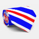 Esta gravata é decorada com um padrão listrado de azul branco vermelho.