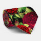 Esta gravata de rosa vermelha apresenta rosas vermelhas vintage e folhas verdes em um fundo preto. Essa gravata seria atraente para padrinhos ou festas de casamento para um casamento com tema vermelho. As rosas vermelhas em preto também seriam perfeitas para o Dia dos Namorados.