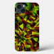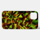 Desenho que lembra fitas interligadas em verde ligeiramente amarelado e castanho avermelhado manchado que lembra algo queimado. A imagem sofreu um efeito 'esculpido' que causou um escurecimento das cores e alguma percepção de brilho em algumas partes e pequenas manchas enrugadas em outras.