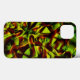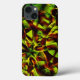 Desenho que lembra fitas interligadas em verde ligeiramente amarelado e castanho avermelhado manchado que lembra algo queimado. A imagem sofreu um efeito 'esculpido' que causou um escurecimento das cores e alguma percepção de brilho em algumas partes e pequenas manchas enrugadas em outras.