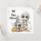 Graveyard Giggles - Mamãe à Lua Uma múmia de olhos largos envolta em bandagens brancas leves fica ao lado de um marcador de pedra, que é parcialmente embrulhado para combinar. Os enfeites de abóbora cor de laranja pequenina penduram nos invólucros da múmia, acrescentando um toque festivo. À sua volta, sorridentes jack-o-lanternas, um fantasma flutuante, e plantas de outono em tons cor de laranja quente e bege criam uma cena acolhedora de Halloween. O design combina o charme assustador com a doçura brincalhona, capturando o espírito da estação com a capricho guiada por personagens.