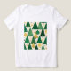 A modern, seamless repeating pattern featuring abstract triangular Christmas trees in varying shades of emerald and forest green. The design is accented throughout with touches of shimmering gold, including hanging baubles and scattered dots, giving the pattern a playful yet elegant texture. The neutral, light-colored background provides a clean contrast to the vibrant festive colors.
