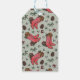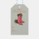 Este slogan de presente To/From, apresenta um par desenhado à mão de botas de natal de vaquinha sentadas entre pinecones, pínus e bagas ocas na frente. A parte de trás apresenta um padrão divertido com estes mesmos elementos ocidentais. O legante plano verde.