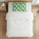 Bright green palm leafs in a clean repeat bring a fresh tropical vibe to your bedroom. Crisp, airy, and modern—pair it with matching pieces in my shop for a coordinated home look.