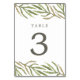 Cartões de números de tabela botânica, elegantes, apresentam folhas verdes de cor d'água no topo e no fundo com o número de sua mesa no centro em verde-oliva rico. Design repete-se no lado oposto. Coordena-se com a nossa suíte de convite de casamento botânico.